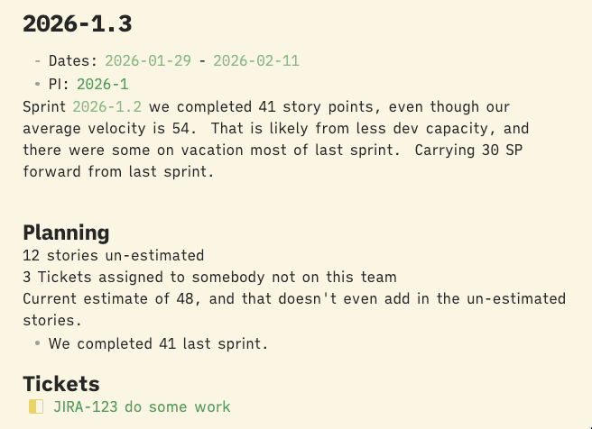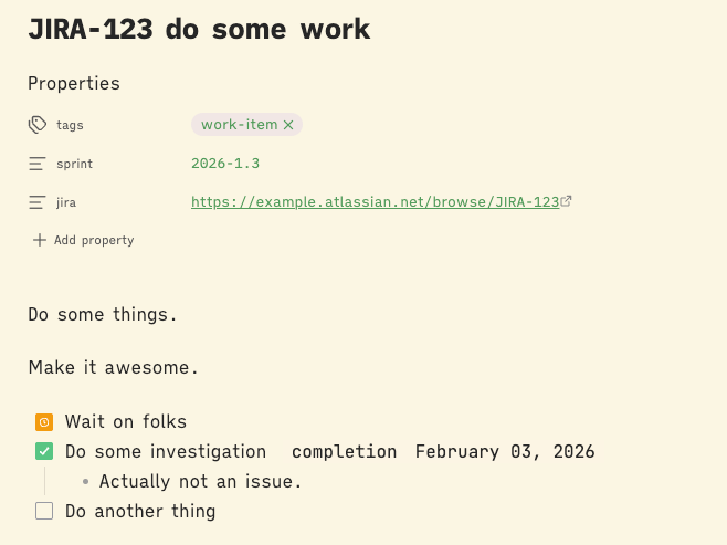 I have a note for each Sprint (2026-1.3) and create a task for each Story that is assigned to me (JIRA-123 in this example).