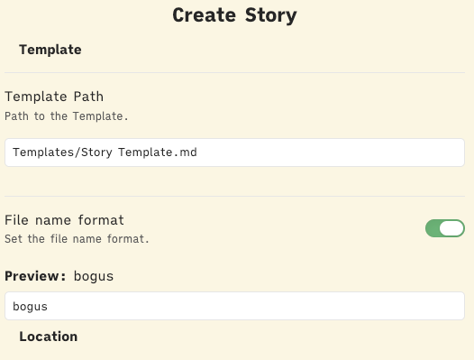 First, I use the Templater plugin. Obsidian’s built-in templating mechanism is quite limited, so I use this plugin to enhance the templating capabilities. I have a template for Stories that looks like this: