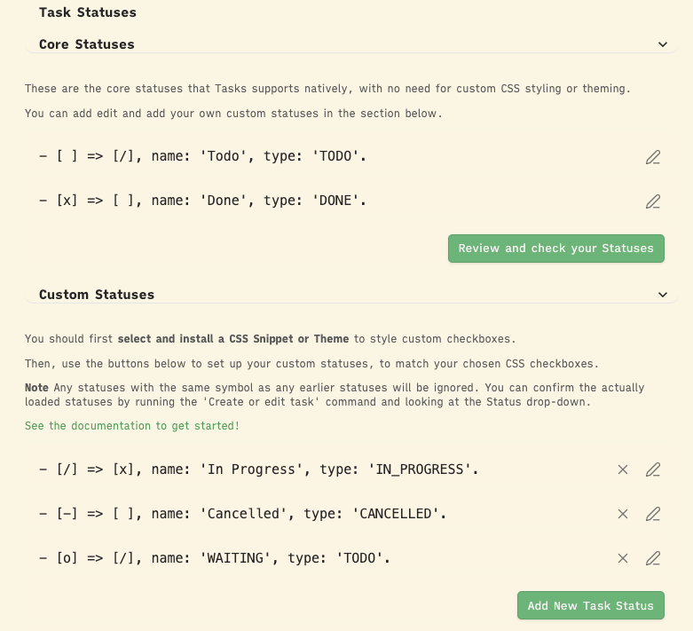 If you use more than the core statuses TODO and DONE it is helpful to add some custom styling to be able to distinguish the task states visually. I use a css snipped originating from https://github.com/netgamesekai/obsidian-checkbox-css that I have tweaked (I think just to add the WAITING status).